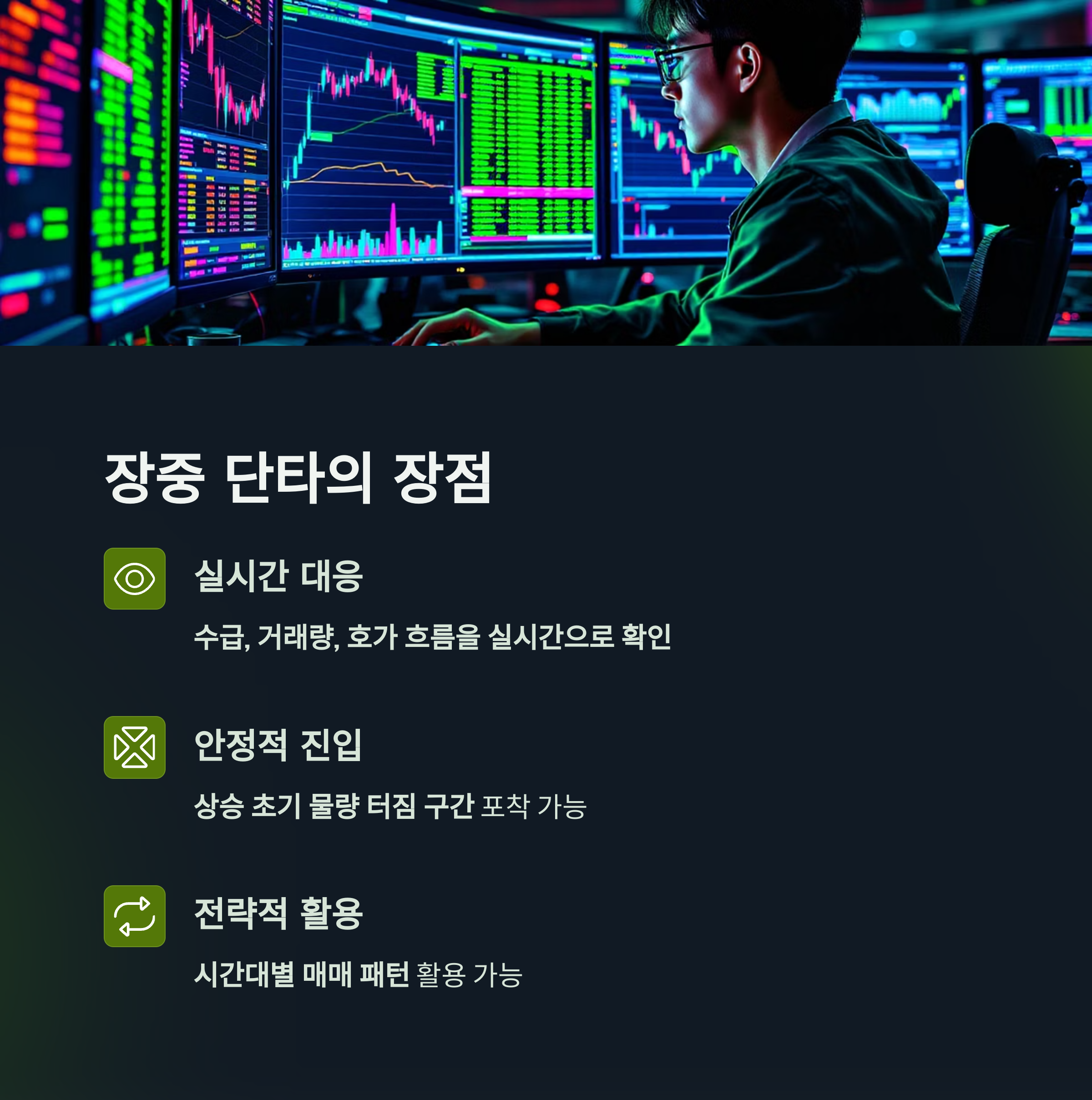 장중 단타는 개장 이후 수급, 거래량, 호가 흐름을 실시간으로 확인하면서 진입합니다.