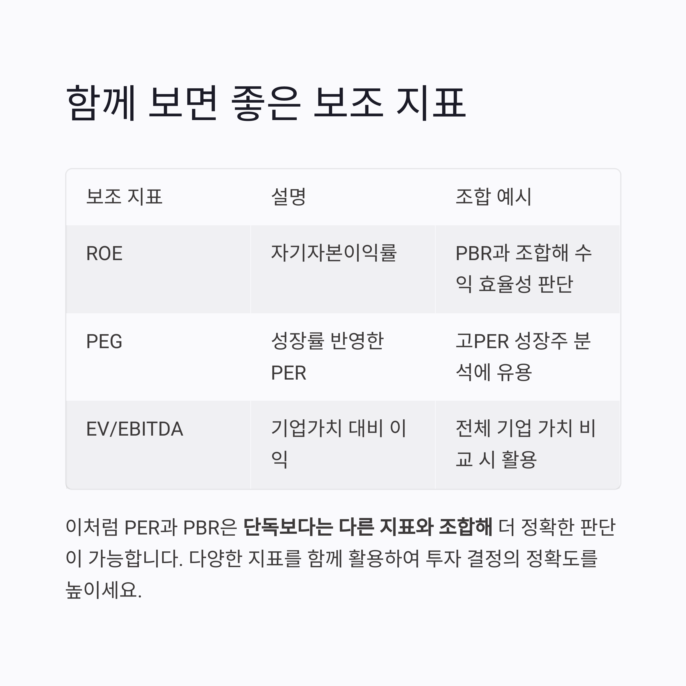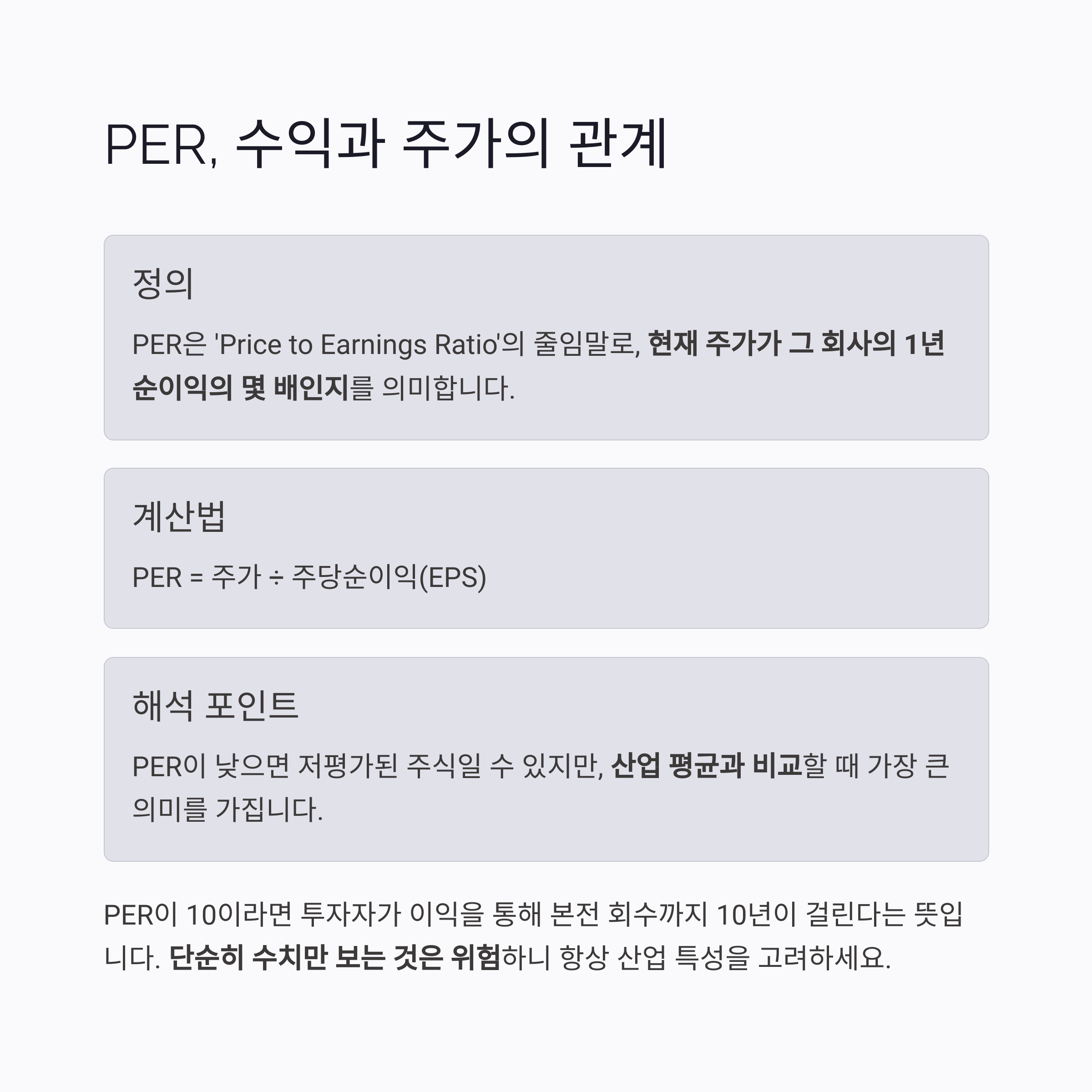 | PER | 주가 ÷ 주당순이익 | 이익 대비 주가 수준 | 수익성 기반 판단 |