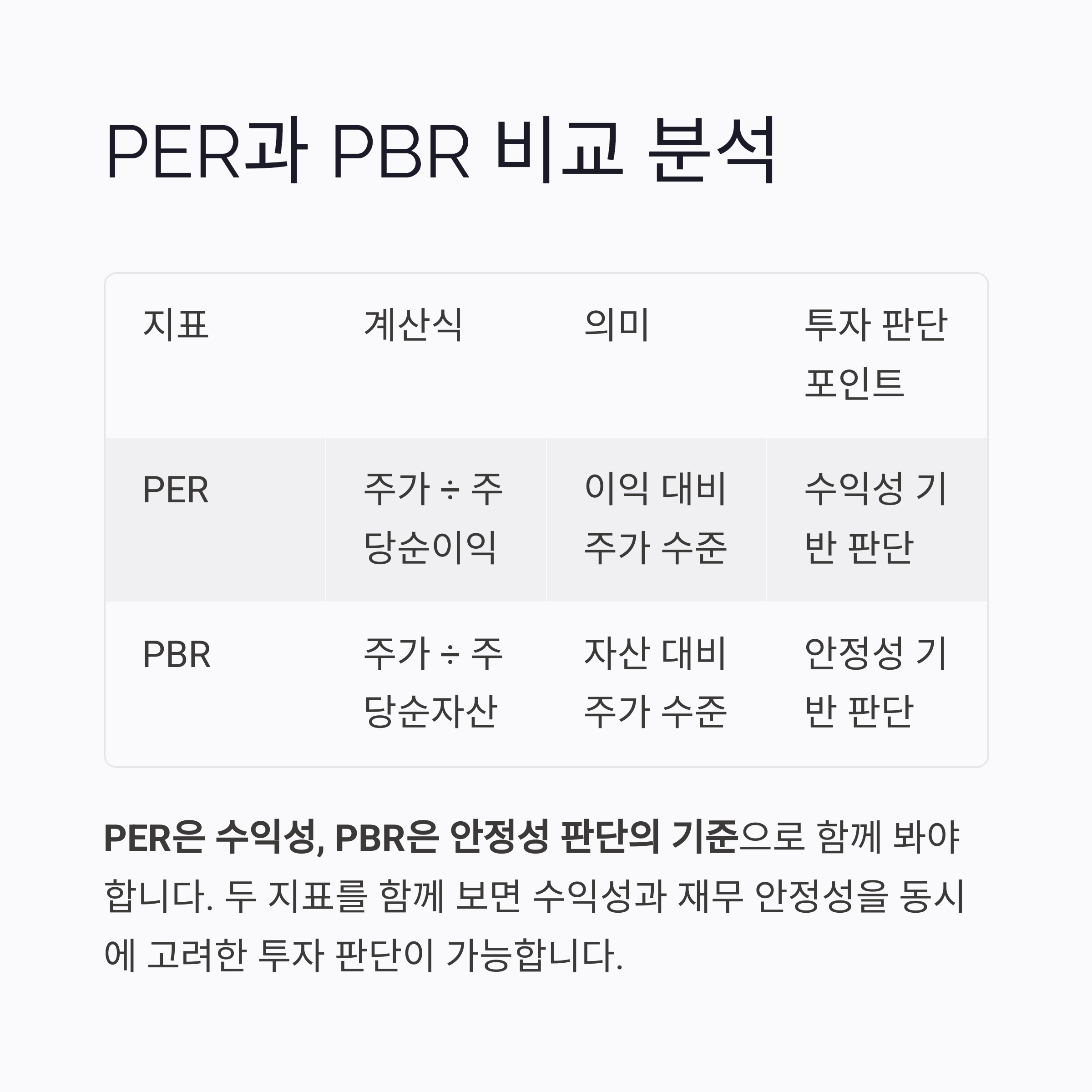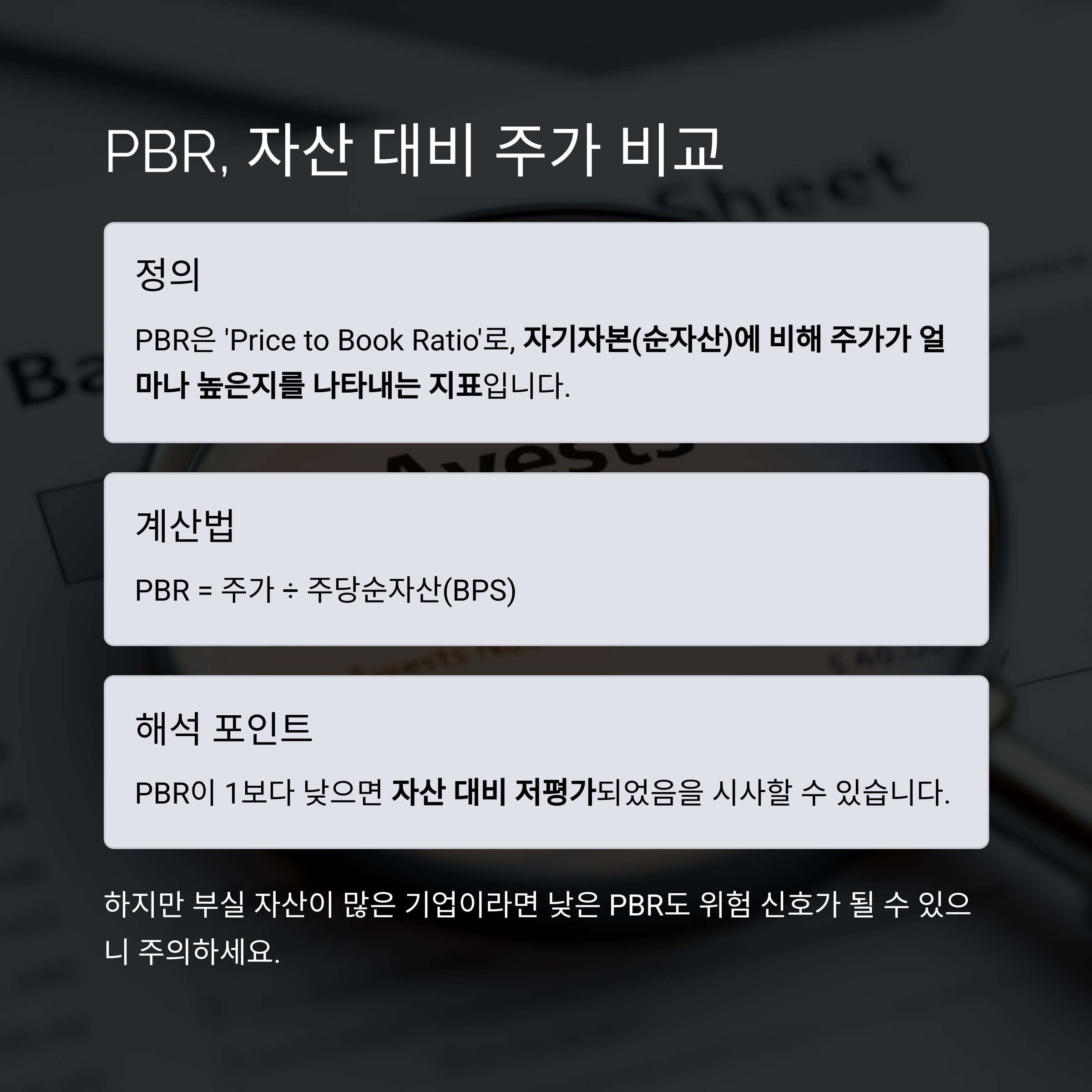 | PBR | 주가 ÷ 주당순자산 | 자산 대비 주가 수준 | 안정성 기반 판단 |