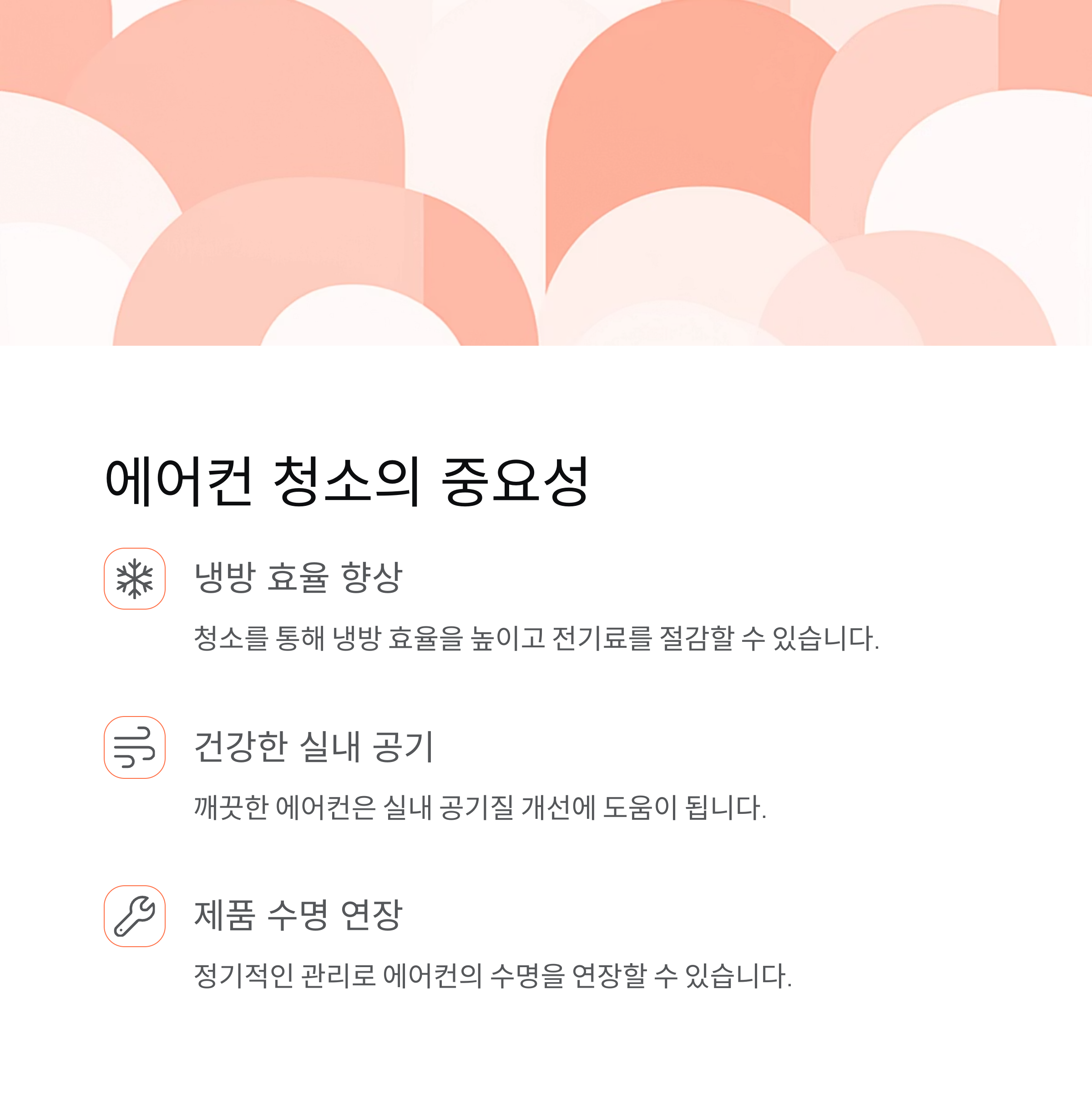 에어컨 청소는 냉방 효율을 높이고 전기료를 절감하며 건강한 실내 공기를 유지하기 위한 핵심 관리 항목입니다.