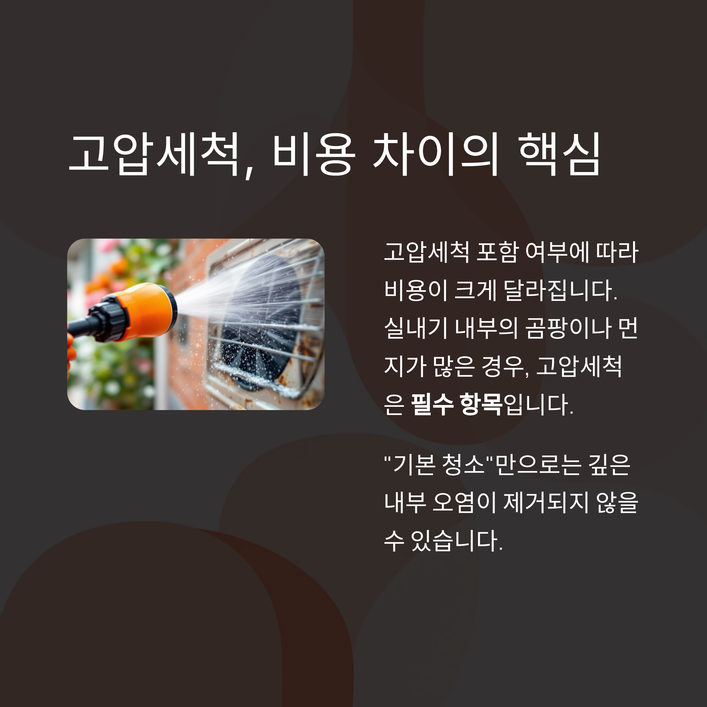 특히 실내기 내부의 곰팡이나 먼지가 많은 경우, 고압세척은 필수 항목입니다.