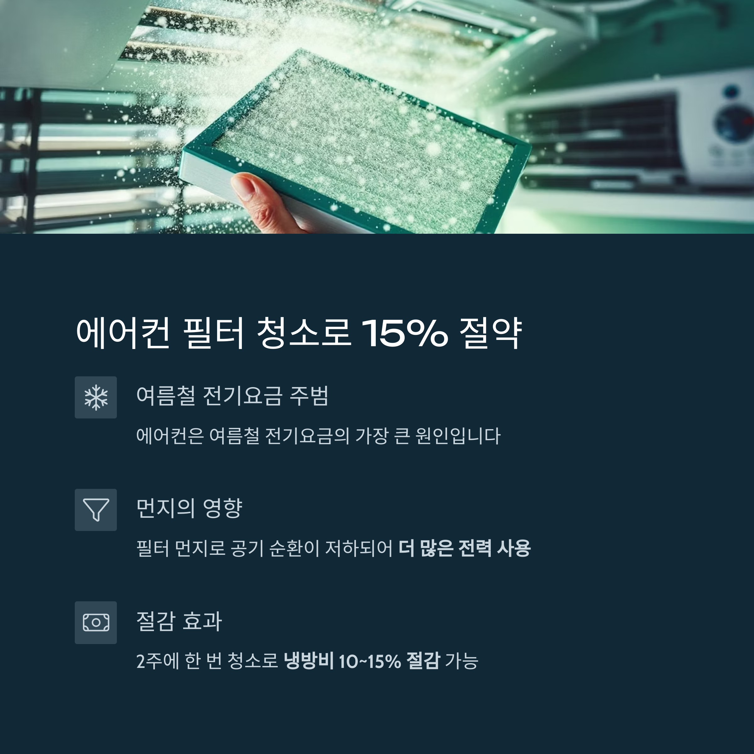 에어컨 필터를 2주에 한 번씩 청소하는 것만으로도 냉방비를 10~15% 절감할 수 있습니다