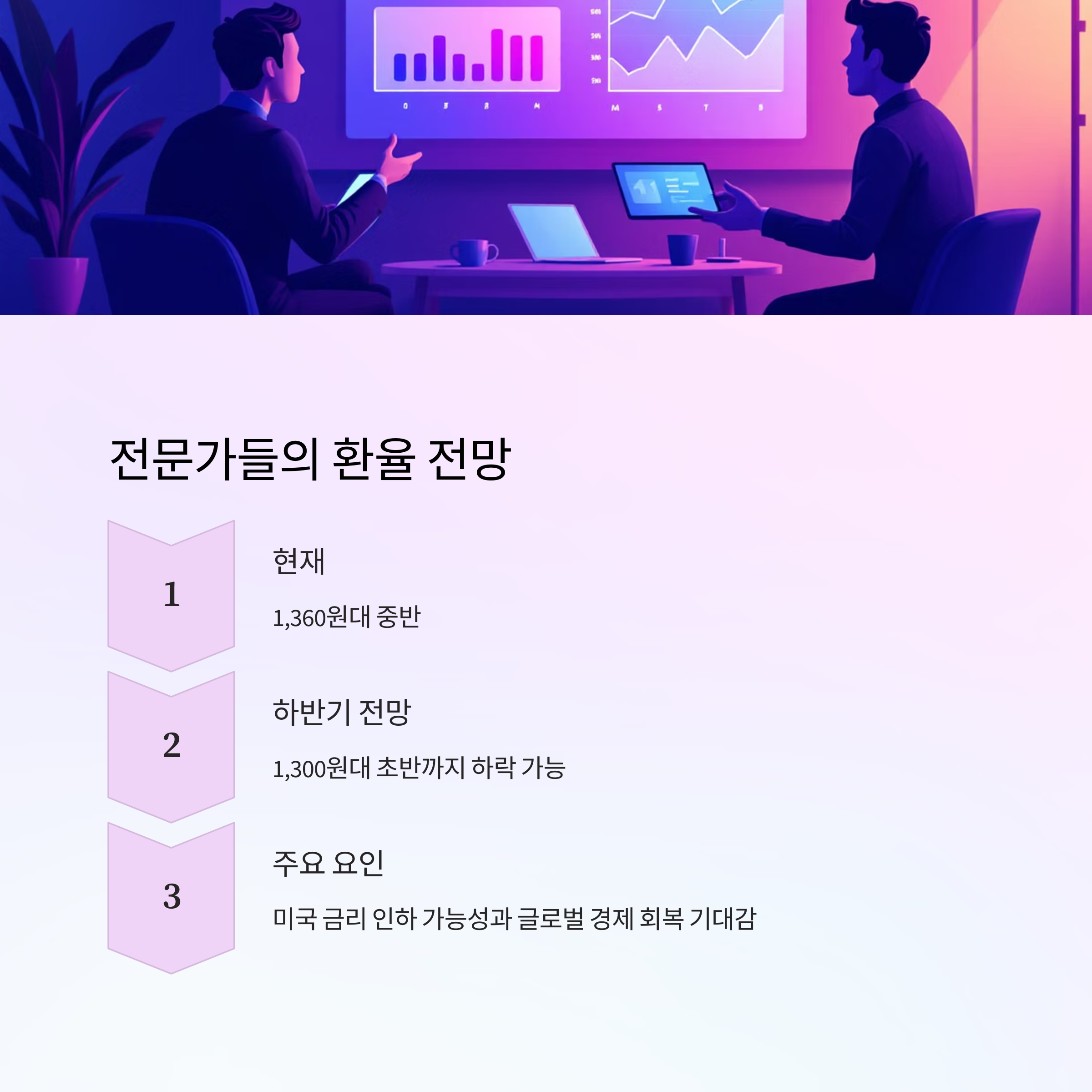 전문가들은 원·달러 환율이 하반기에는 1,300원대 초반까지 하락할 수 있다고 전망하고 있습니다. 이는 미국의 금리 인하 가능성과 글로벌 경제 회복에 대한 기대감 등이 반영된 결과입니다.