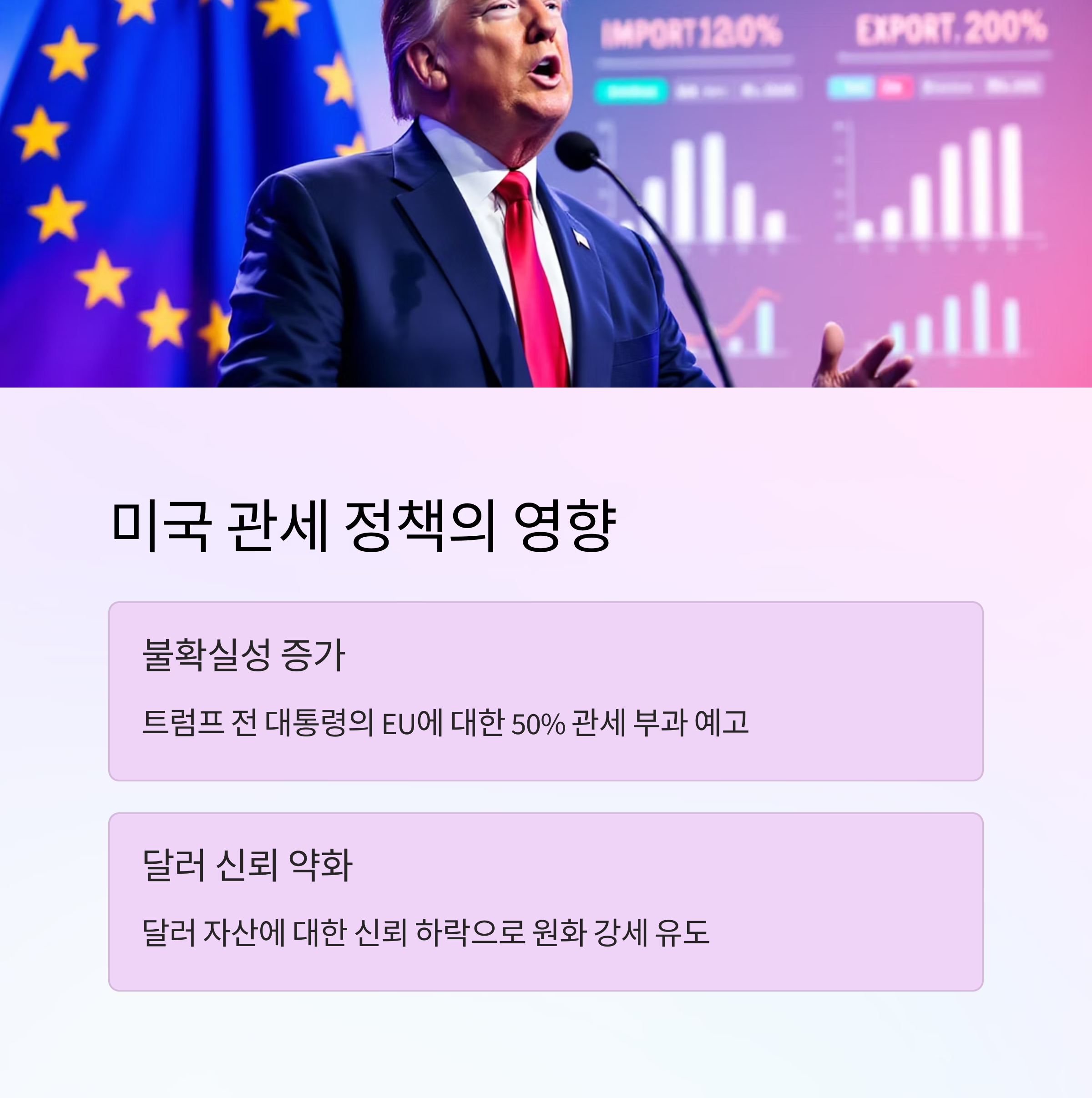 도널드 트럼프 전 미국 대통령이 유럽연합(EU)에 대한 50% 관세 부과를 예고하면서 시장의 불확실성이 증가했습니다. 이에 따라 달러 자산에 대한 신뢰가 약화되었고, 이는 원화 강세로 이어졌습니다.