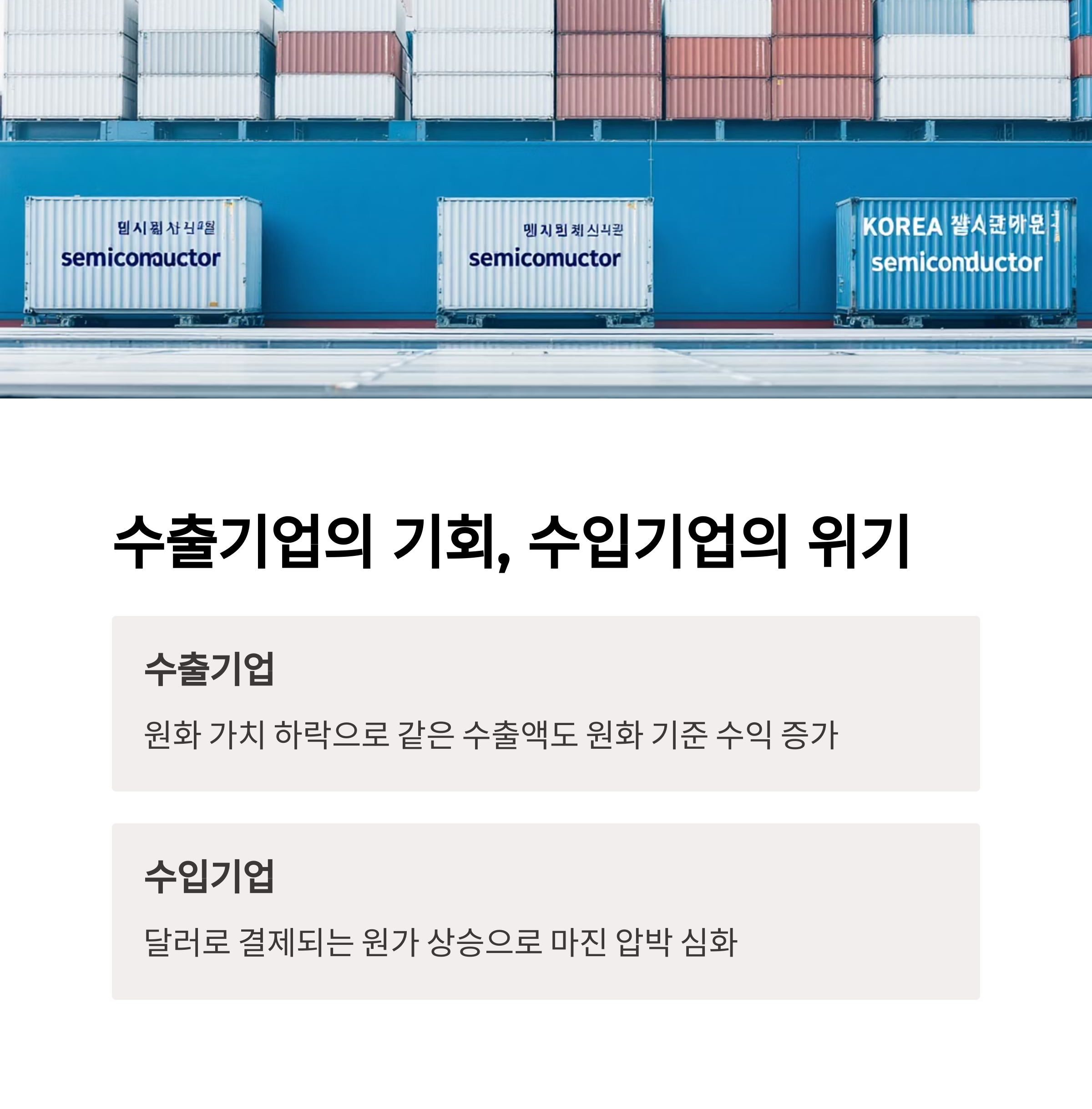 | 수출업 | 수익성 증가, 원화 환산 이익 확대 | 긍정 |