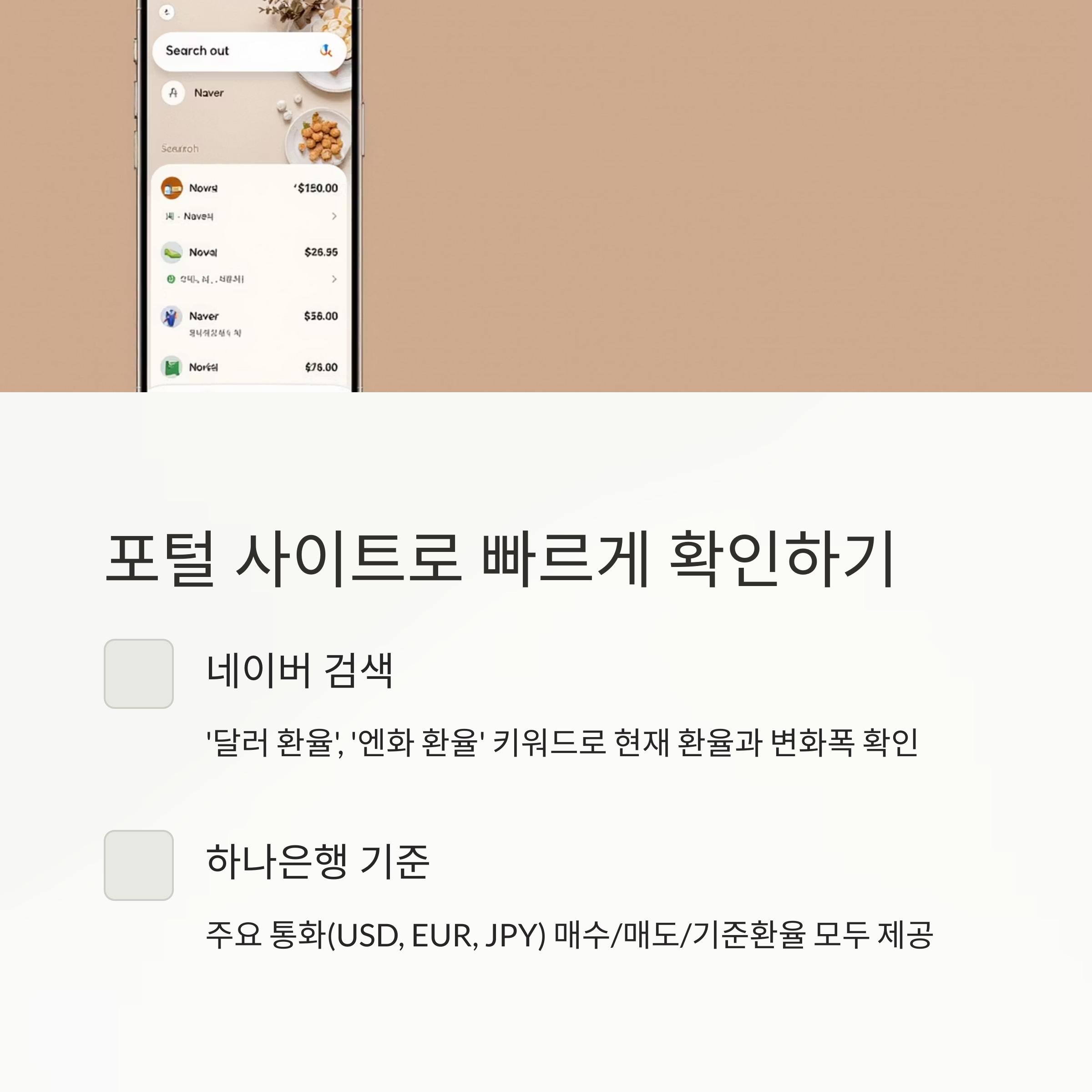 네이버 환율은 하나은행 기준이며, 주요 통화(USD, EUR, JPY 등) 기준으로