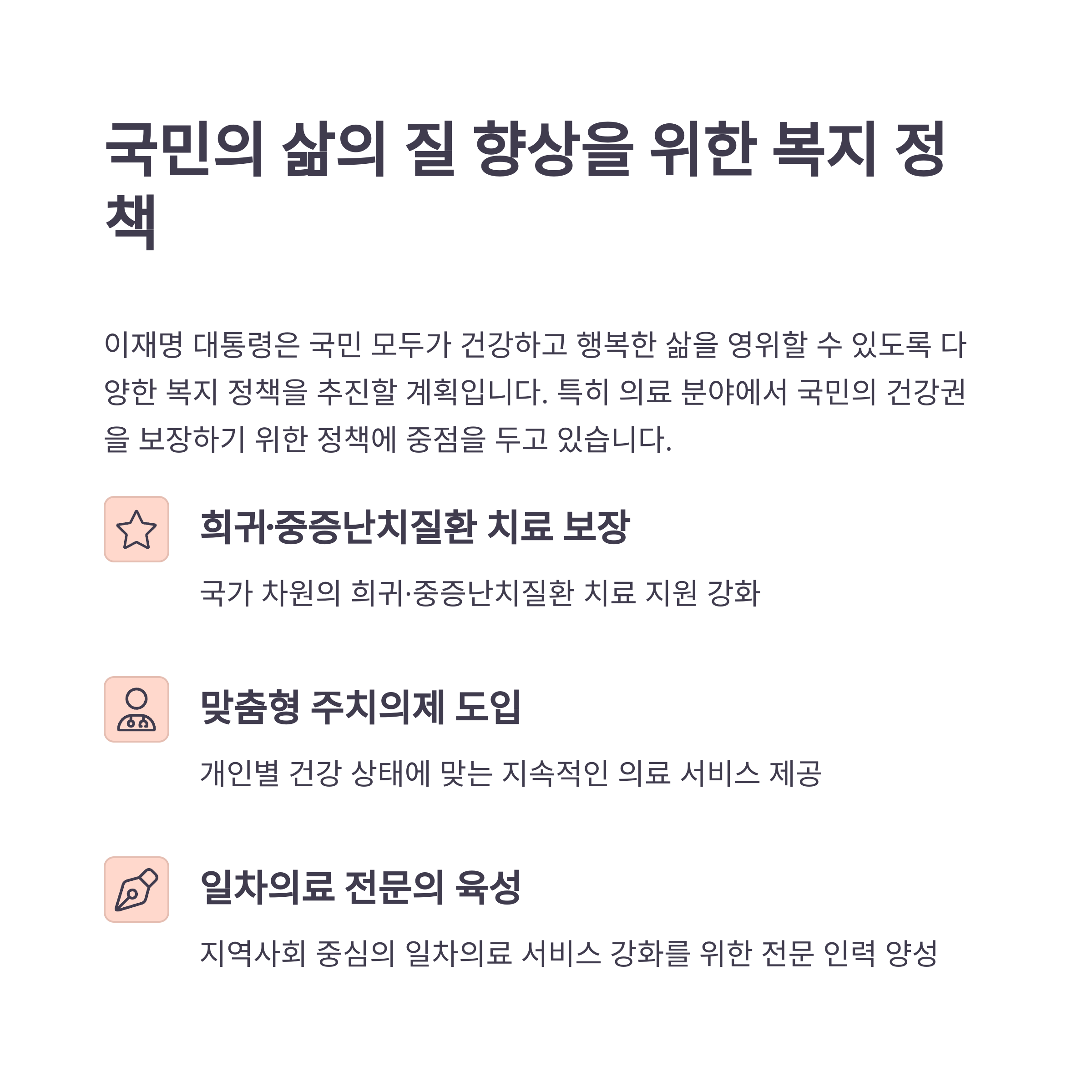 희귀·중증난치질환 치료의 국가 보장 강화와 맞춤형 주치의제 도입 등을 통해 국민의 건강권을 보장하고자 합니다. 또한, 일차의료 전문의 육성체계 마련 등을 통해 의료서비스의 질을 향상시키고자 합니다. (doctorsnews.co.kr)