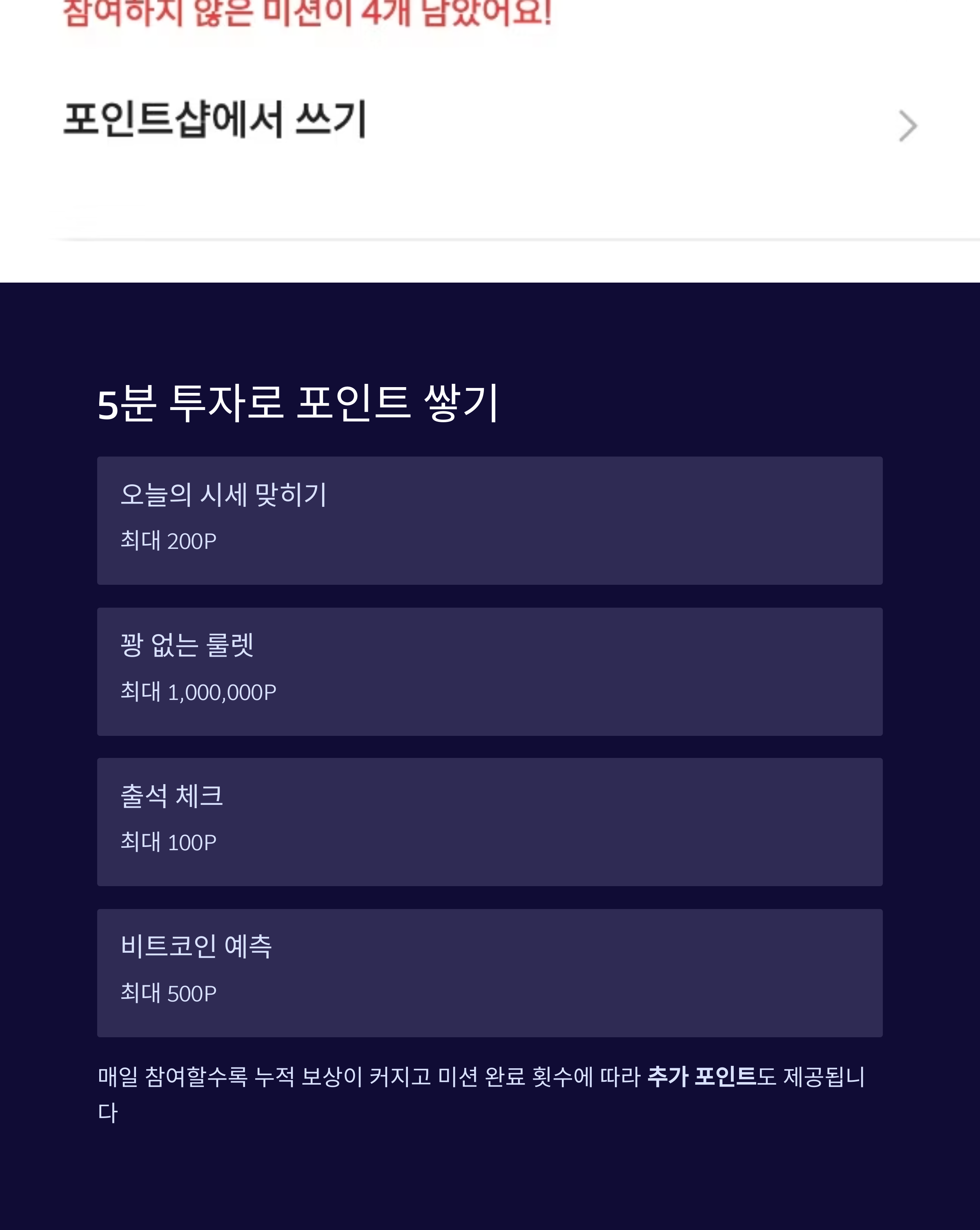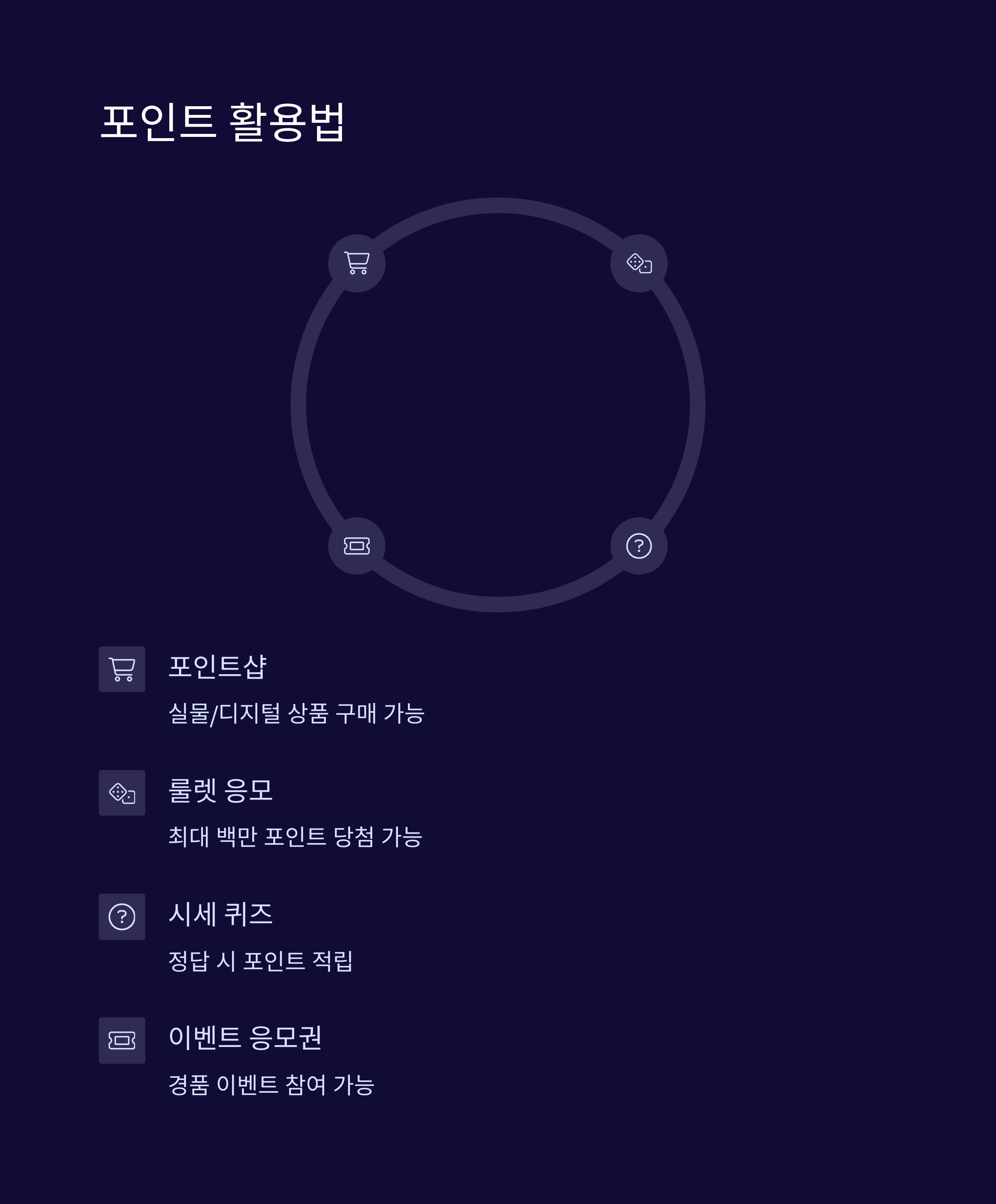 포인트 미션, 출석 체크, 룰렛 게임 등 다양한 방식으로