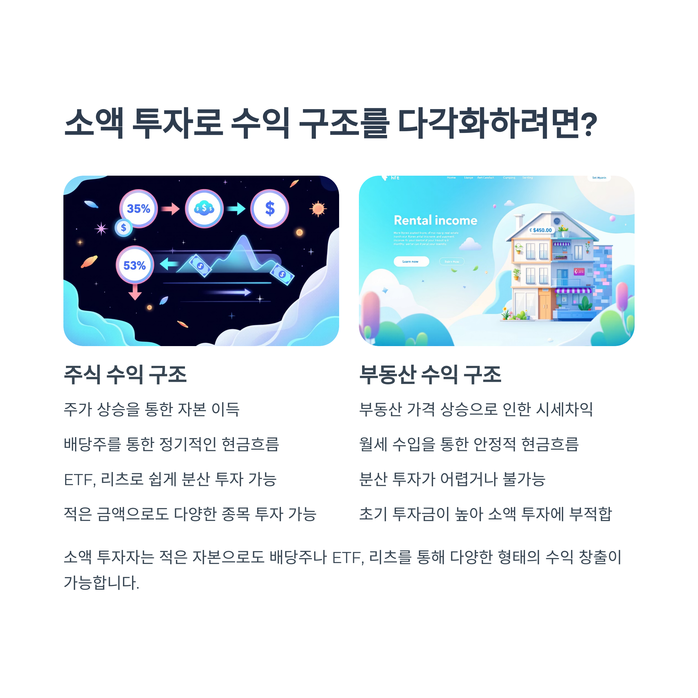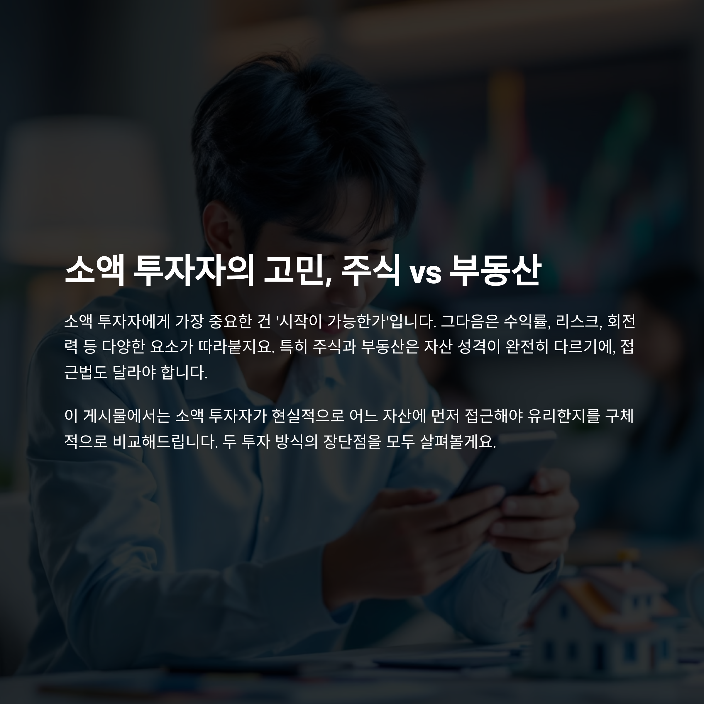 소액 투자자에게 가장 중요한 건 '시작이 가능한가'입니다. 그다음은 수익률, 리스크, 회전력 등 다양한 요소가 따라붙지요. 특히 주식과 부동산은 자산 성격이 완전히 다르기에, 접근법도 달라야 합니다. 이 글에서는 소액 투자자가 현실적으로 어느 자산에 먼저 접근해야 유리한지를 구체적으로 비교해드립니다.