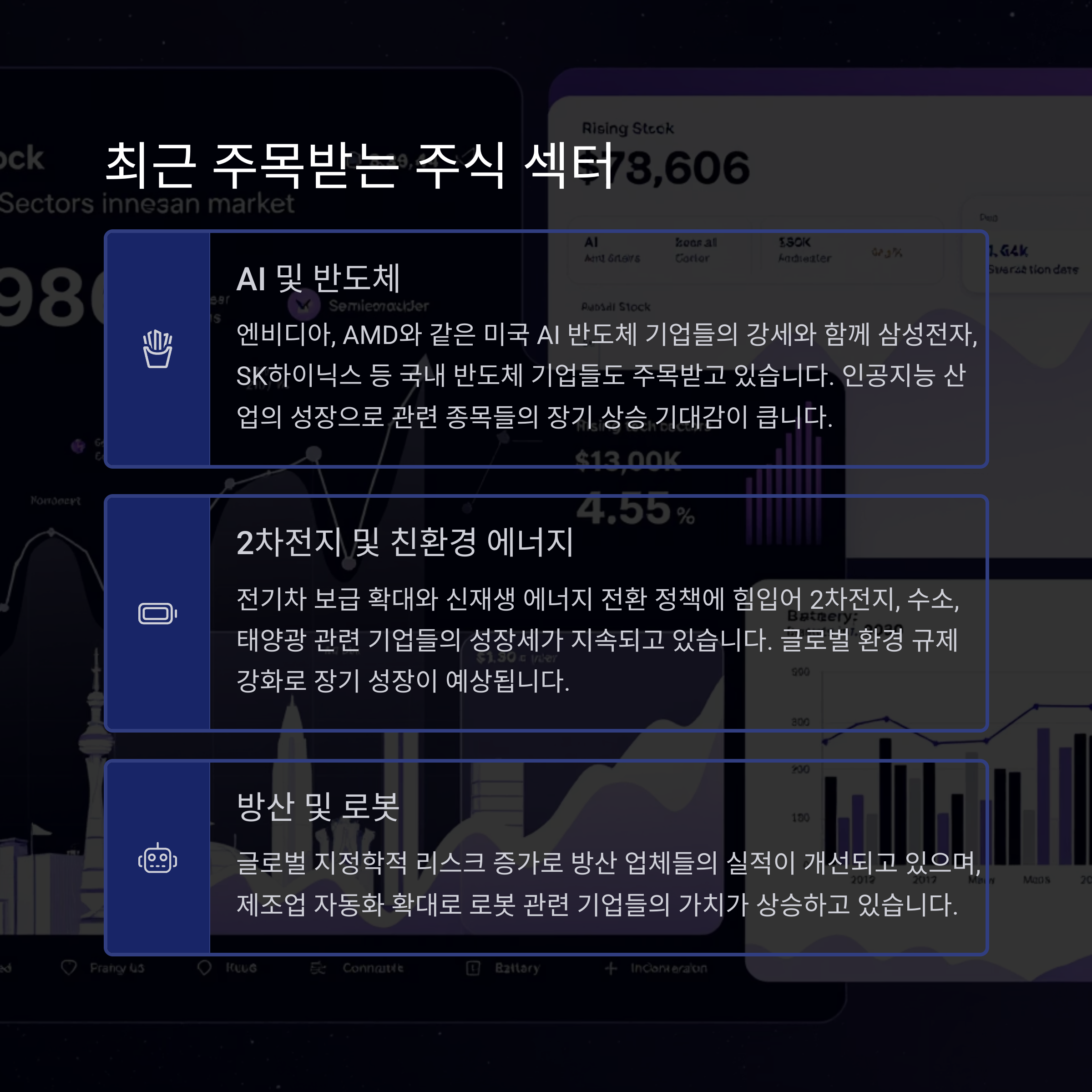 주식시장에서는 AI, 2차전지, 반도체, 방산, 로봇 관련 종목들이