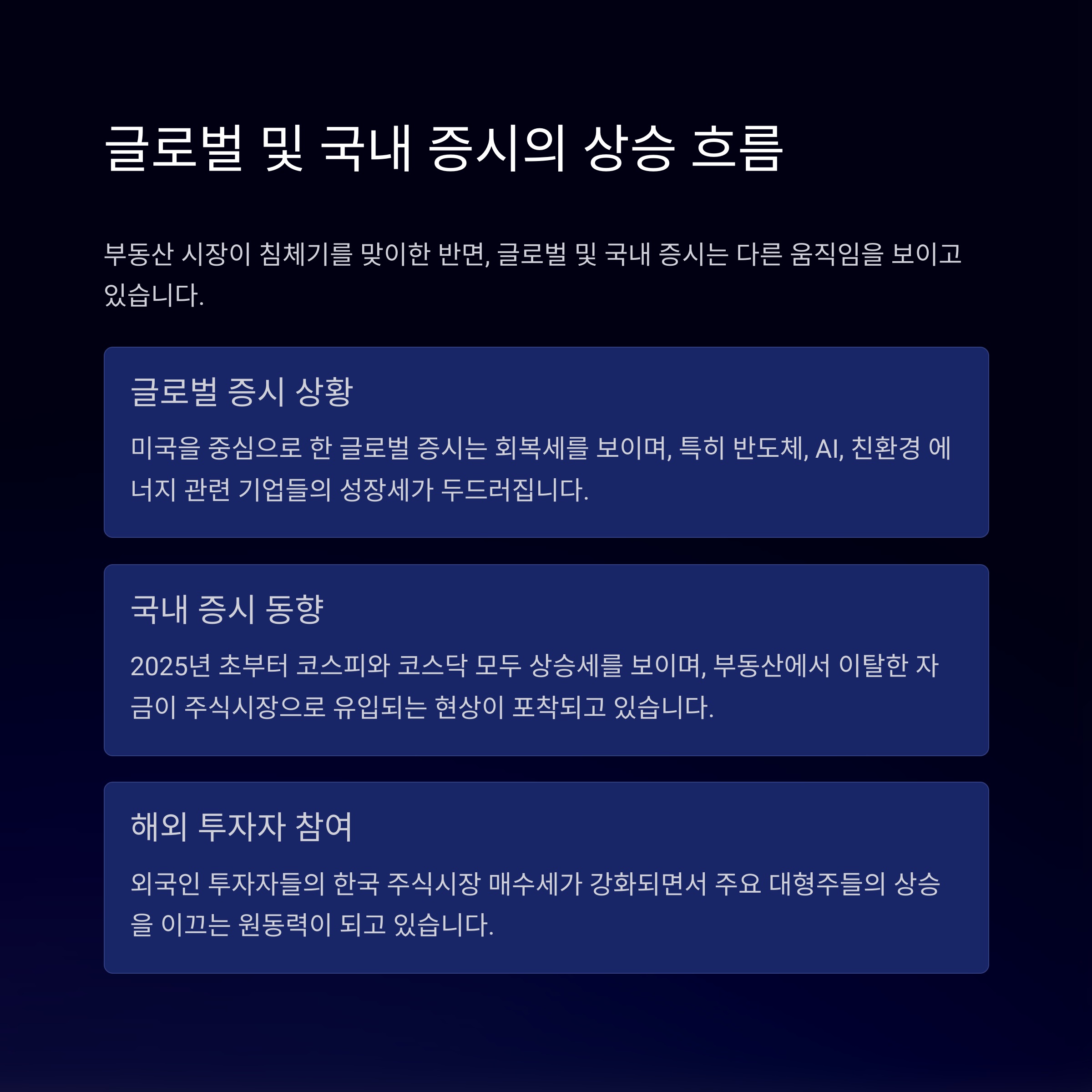 이번 글에서는 현재의 부동산 시장 흐름, 주식시장 전망, 자산 이동 시 고려할 점들을
