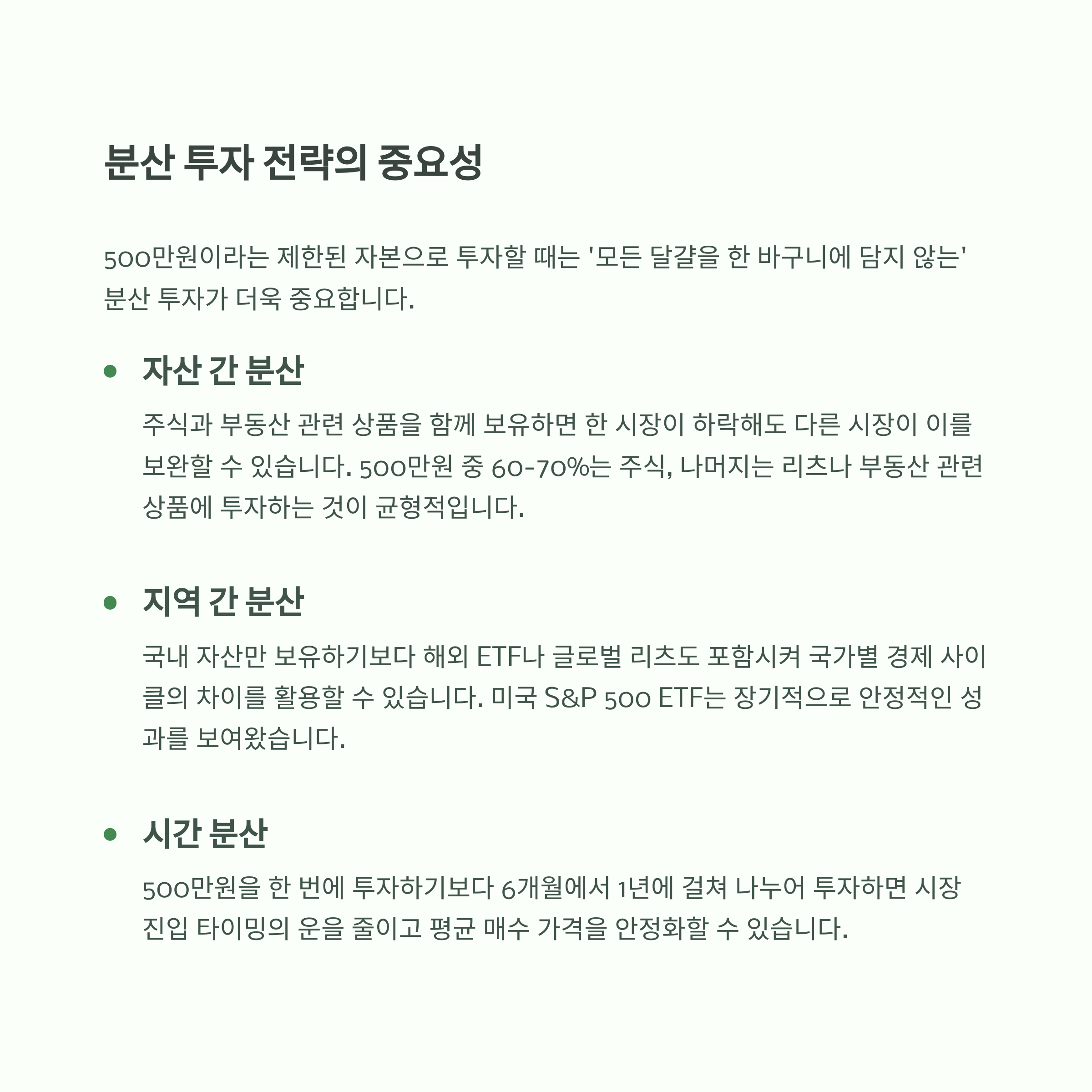 500만원을 한 자산에 올인하는 것은 리스크가 큽니다.