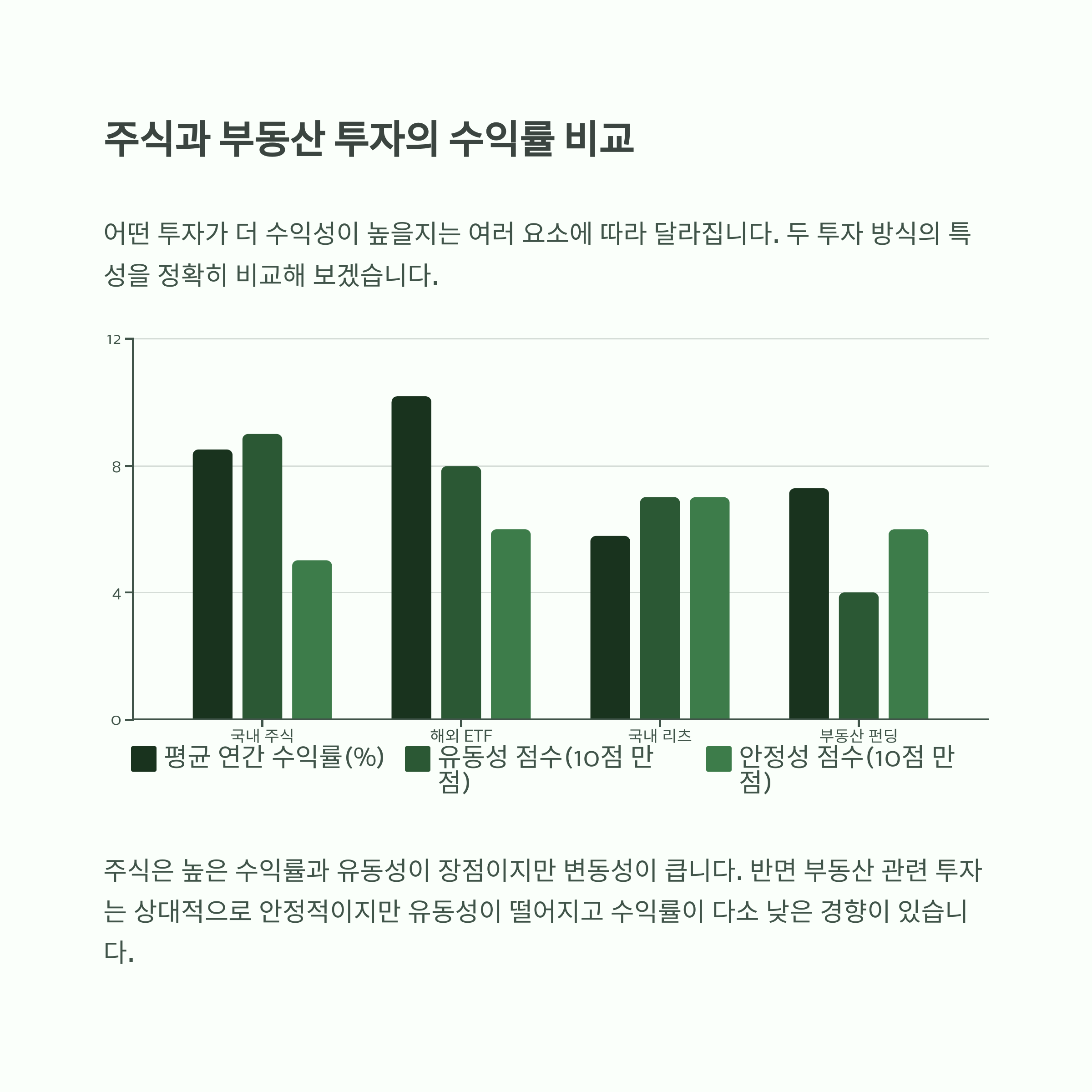 | 리스크 | 시장 변동성에 민감 | 자산가치 하락 위험 존재 |
