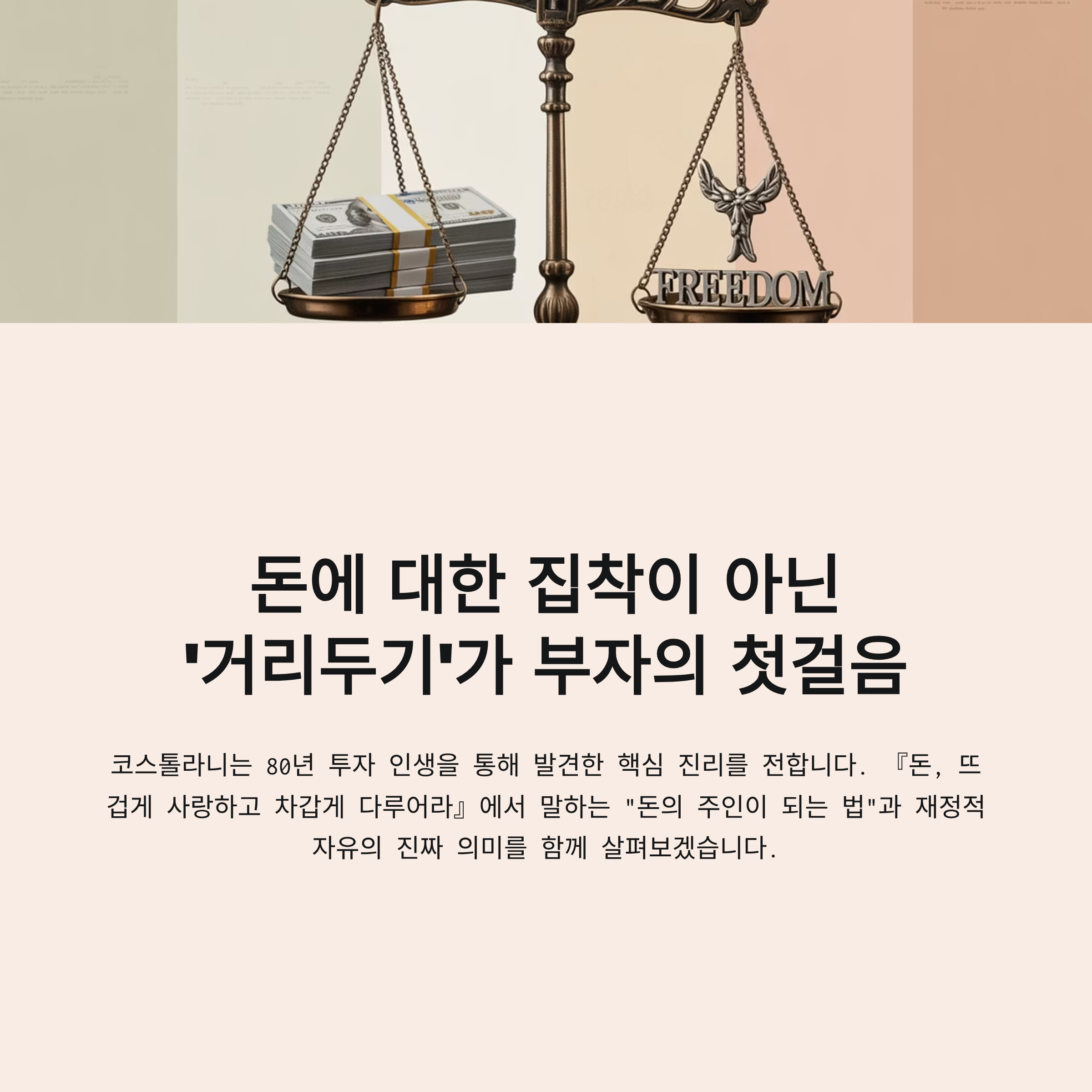 코스톨라니는 80년 투자 인생을 통해 돈에 대한 집착이 아닌 **‘거리두기’**야말로 진정한 부자의 첫걸음이라고 말합니다. 이 글에서는 『돈, 뜨겁게 사랑하고 차갑게 다루어라』의 핵심 철학 중 하나인 “돈의 주인이 되는 법”에 대해 다룹니다. 재정적 자유의 의미, 돈과 감정의 거리, 진짜 부자의 정의까지 함께 생각해보겠습니다.