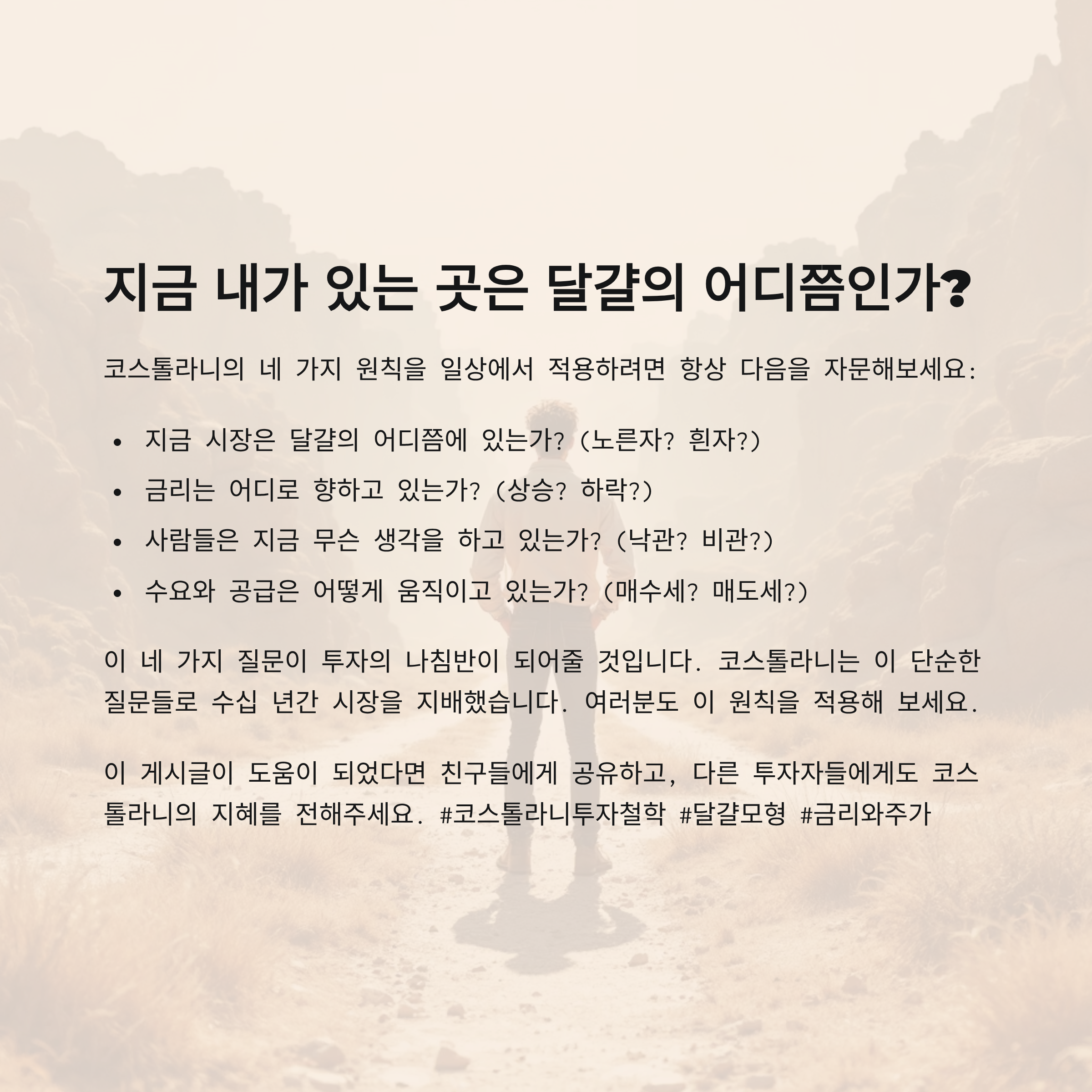 시장에는 수많은 정보가 넘쳐나지만, 코스톨라니는 단 네 단어만 제대로 이해하면 시장을 꿰뚫을 수 있다고 강조했습니다. 이 글에서는 『돈, 뜨겁게 사랑하고 차갑게 다루어라』에서 제시된 생각, 수요·공급, 금리, 달걀이라는 핵심 키워드를 통해 코스톨라니 투자 철학의 본질을 살펴봅니다. 시장을 움직이는 보이지 않는 손과 투자자의 심리, 돈의 흐름까지, 단순하지만 강력한 이 네 단어가 말하는 진짜 투자 이야기를 전해드립니다.