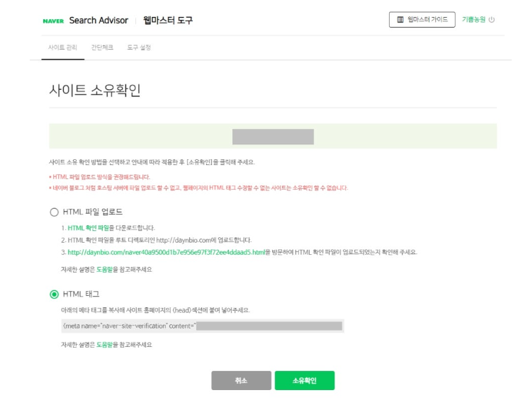 사이트 소유 확인을 위해 네이버가 제공하는 메타 태그를 내 워드프레스 블로그에 추가해야 합니다. 소유 확인을 위해 아래 두 가지 방법 중 하나를 선택할 수 있습니다.