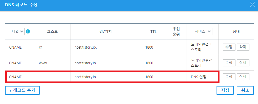 - 호스트: 원하는 내용을 입력합니다. 예를 들어, 공부용 블로그를 위한 서브도메인이기 때문에 '1'로 입력하였습니다.