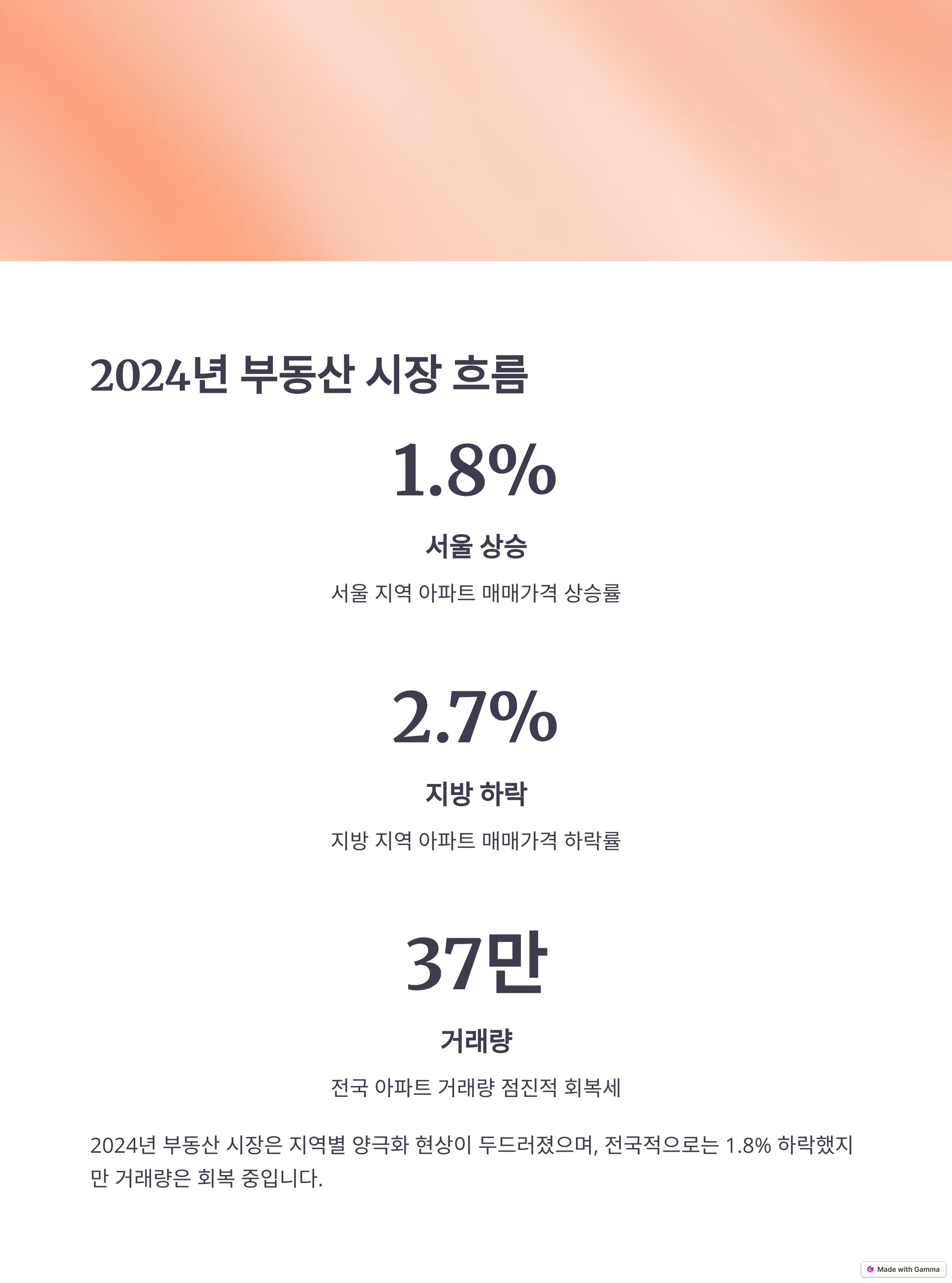 2024년 부동산 시장은 그야말로 변화의 연속이었습니다. 거래량이 급감하고, 수도권 아파트 시장은 일시 정지된 듯한 분위기를 보이기도 했습니다. 일부 지역에서는 약한 반등이 있었지만, 이는 전체 상승세라기보다는 지역적 특수 요인에 의한 부분 회복이었죠. 특히 금리와 대출 규제는 실수요자들의 발목을 붙잡았고, 무엇보다 정책의 불확실성이 시장 전체의 흐름에 큰 영향을 주었습니다. 이 모든 요소들이 얽히며 2025년의 시장을 예측하기 더 어렵게 만들고 있습니다.