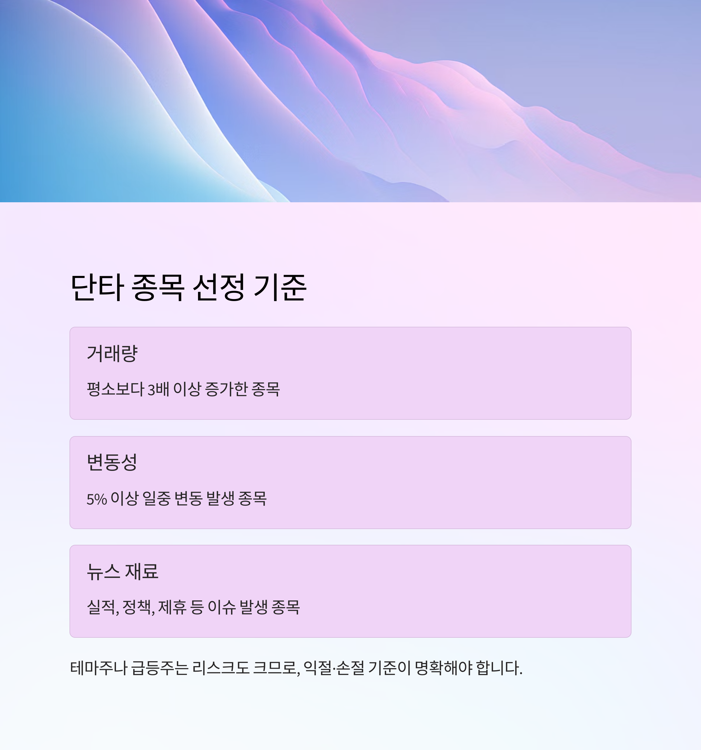 단타 종목 선정은 거래량, 변동성, 이슈 유무가 핵심 기준입니다.