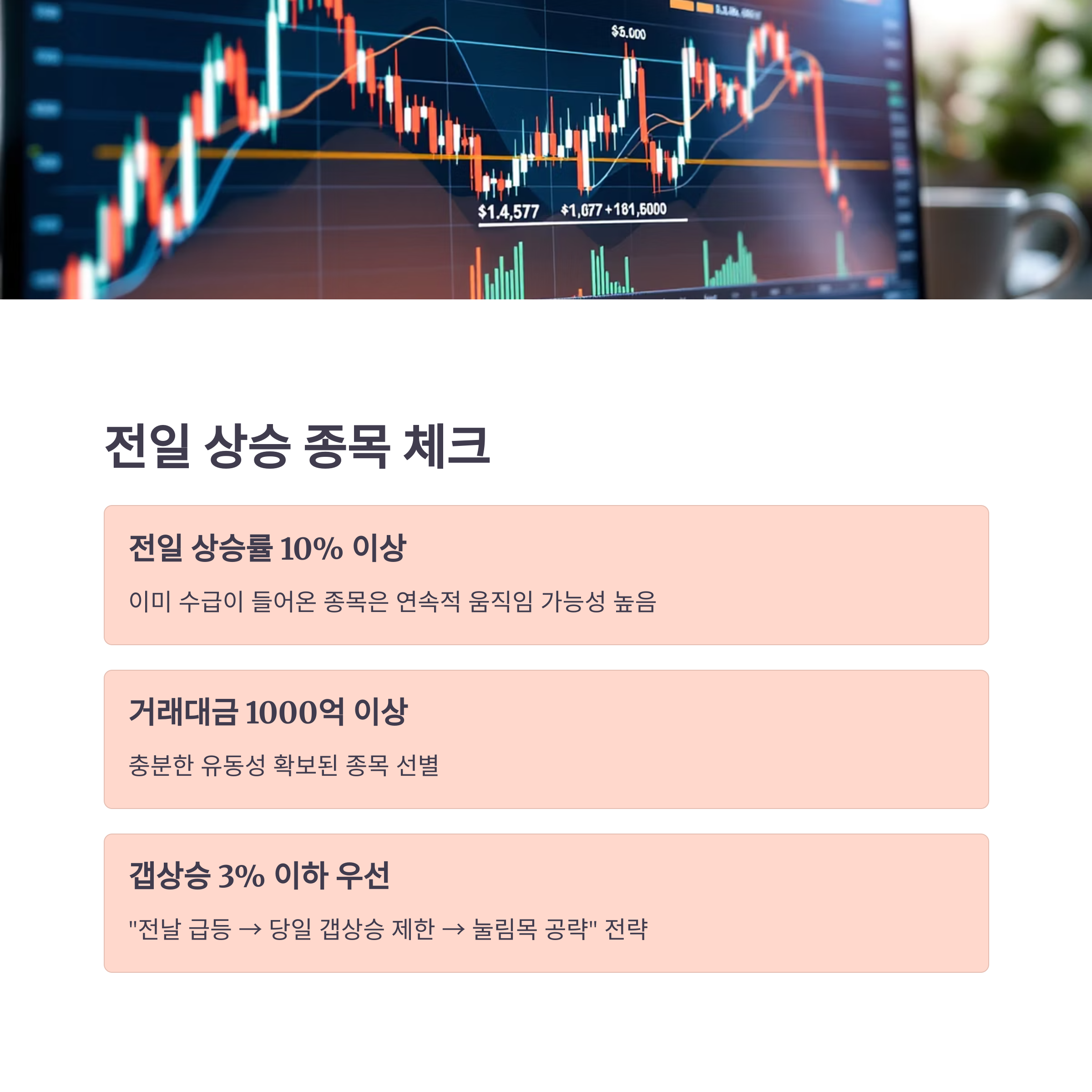 "전날 급등 → 당일 갭상승 제한 → 눌림목 공략"이 기본 전략입니다.