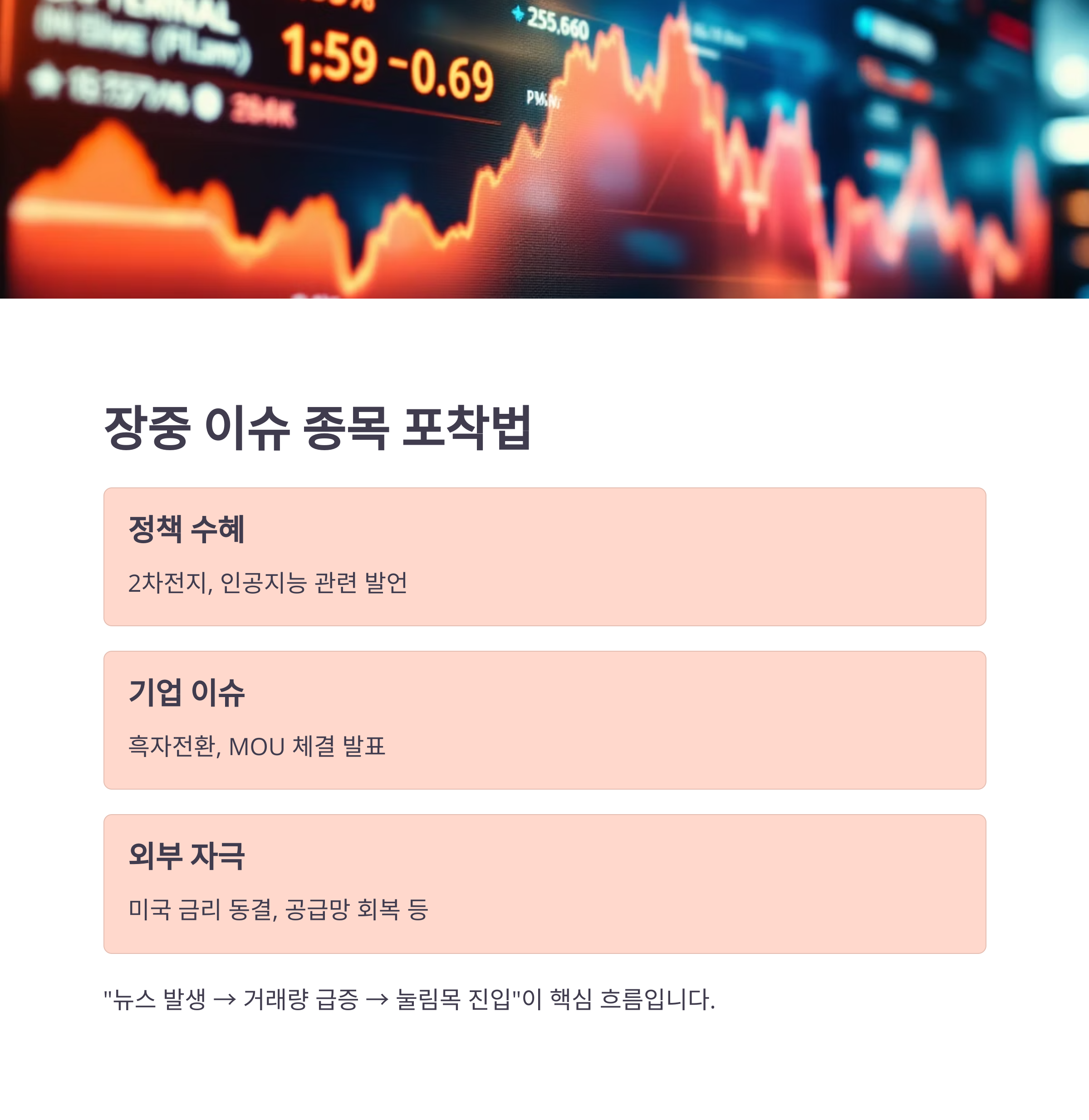 "뉴스 발생 → 거래량 급증 → 눌림목 진입"이 핵심 흐름입니다.