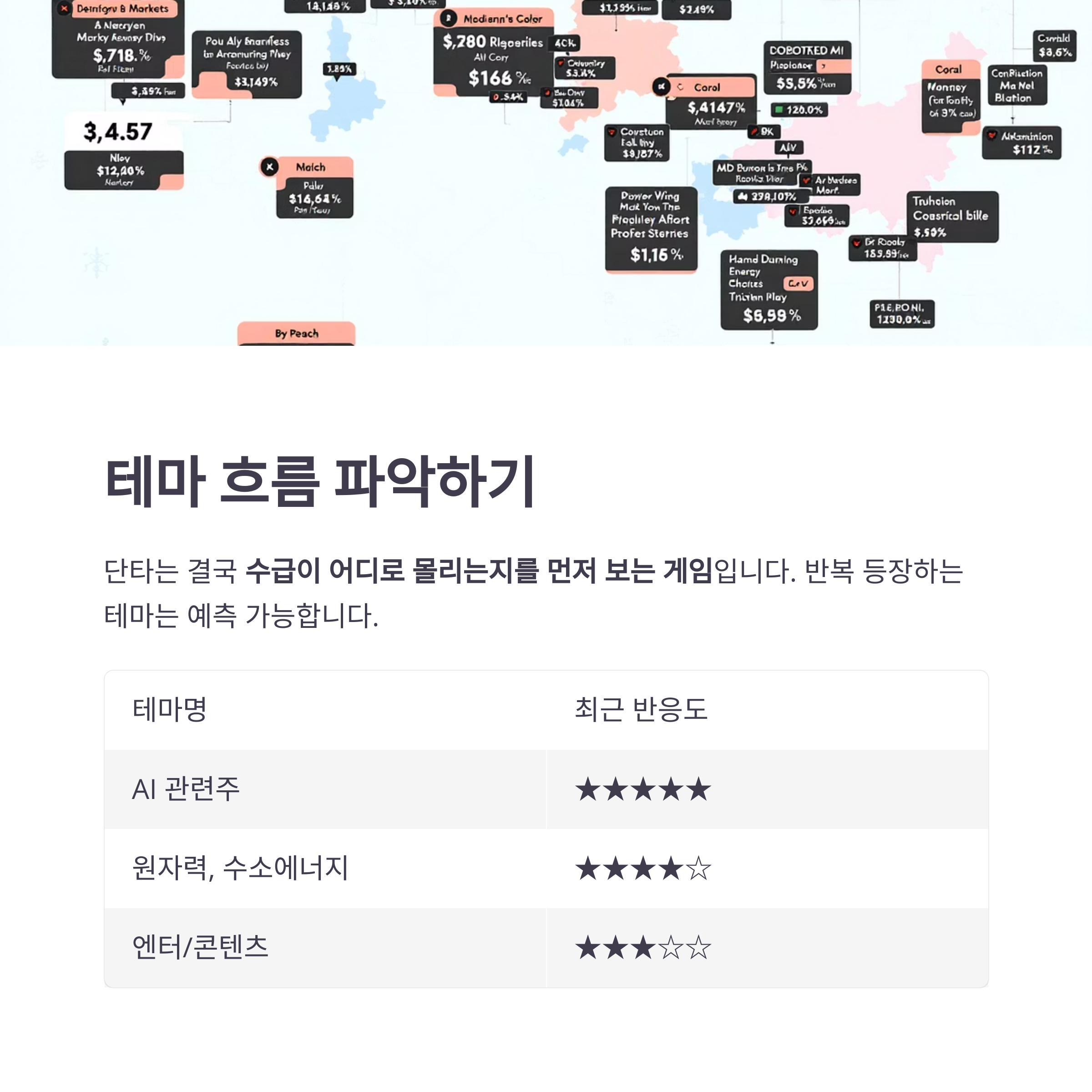 "테마 → 종목 압축 → 기술적 흐름 → 진입 타이밍"