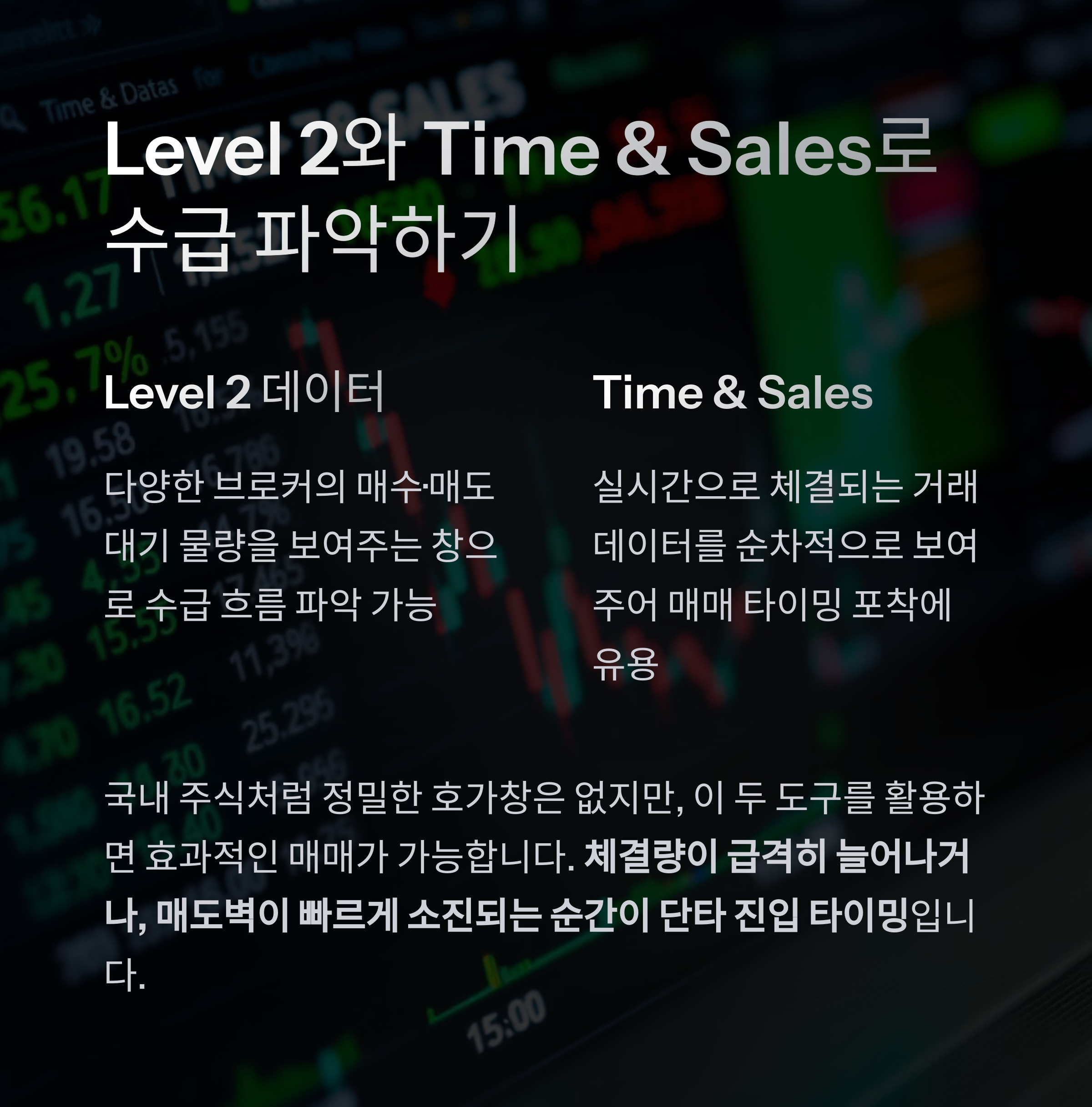 국내 주식처럼 정밀한 호가창은 없지만, Level 2 데이터와 Time & Sales로 수급 흐름을 파악할 수 있습니다.